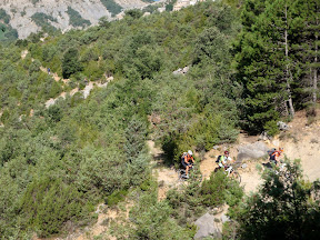 Jose, Vicent i Zam estan prou groguis i decideixen parar a dinar. Nosaltres estem prou be i preferim acabar la baixada i ja dinar als cotxes. Així que els 5 seguim baixant. Aquesta part tal vegada es la que més ens va agradar de totes les rutes (i no se si dir de totes les que hem fet, encara que realment he disfrutat molt amb cadascuna d’elles)… la senda va agafant pendent i convertint-se en un pedregal, quasi recte, i llarguisima (tenim que parar a meitad a reagrupar-se i descançar els braços). “superhipermega” divertida!!!.