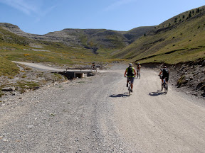 Aquesta ruta es la que hi ha posada a la web de gpsprinieo amb aquest nom, però Jorf ens va sugerir algunes millores per a fer-la una mica més llarga i endurera. La ruta la varem començar al mirador de Tella del Canyò d’Añisclo, on varem deixar els cotxes. Després d’una mica de carretera i carregar aigua (es l’única font de tota la ruta fins el primer poble ja de baixada), passem per Nerín i deixem l’asfalt per pujar per la famosa, i fins ara prohibida a les bicicletes, pista de las Cutas. Aquesta pista ha estat durant moooolts anys tallada injustament al pas de bicicletes, encara que era el recorregut natural de la Transpirenaica i de no haver motius mediaambientals. Finalment gracies a la gent local i a IMBA la pista ha estat oberta al pas de les bicis. I gracies a deu, perque la veritat es que ningú deuria de deixar de veure el que es veu des de dalt.