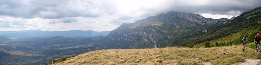 Sols per aquestes vistes, ja valdria la pena la ruta encara que tinguerem que baixar per pista, però afortunadament no es així. Desfem el camí fins a la entrada del PR seguint la polsosa pista i en aquest punt comença lo bò tècnicament parlant: proteccions i baixada de sillí i a seguir el PR, que inicialment es troba perdut per la pradera coberta d’herba per una i amb poc desnivell. Seguidament fem un pass tècnic per a baixar a una altra pradera mès baixa on el camí ja és más evident. Poc a poc la pradera va deixant pas a les roques i a la zona d’arbustos. En aquest punt ve la zona mès tècnica, que en certa forma em recordava a algunes parts de la ruta Txeca (més verda i sense tanta secor i pedra solta), però la senda discorria entre roques que deixaven un estret pass i corbes molt tancades (ara entenc el que va dir Jorge de que si teniem algún canvi de repost, l’agafarem). La senda es podia fer quasi tota ciclada, però requeria d’una gràn tècnica i força, ja que no tenia maça desnivell i hi havia pedalejar al temps que superaves els obstacles rocosos. Realment era un tram que t’exprimia.