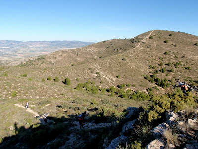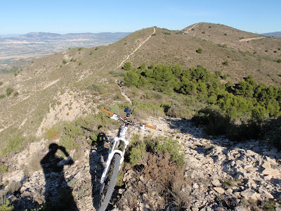 La baixada continua fins creuar per primera vegada una pista, i Javi tira per la pista per anar sense canvi, Oscar per acompanyar-lo i David per anar amb la rígida i tindre els braços destroçats… David, con estas rutas no llegas a enero, jeje. La resta fem un tram mes de senda molt guapa i arribem a una altra pista. El primer enllaç que tenim que fer ací no existeix (coses de les ortofotos), així que tenim que continuar per la pista i fer un petita volta per retrobar el track perdut i retrobar als “pisteros”. Quan els, trobem Javi tira pista avall fins a trobar Xixona on finalment aniran anat a arreplegar-lo. La resta a seguir, que encara queda.