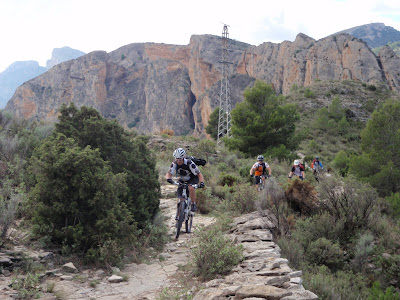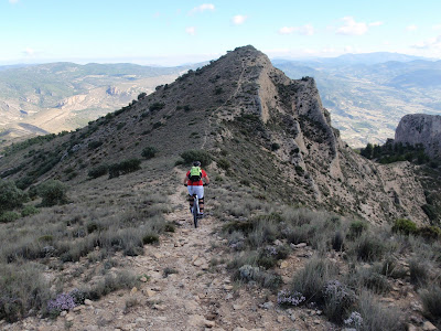 De nou el lloc per on tenim que baixar per arribar a la font, sembla un precipici a les corves de nivell dels mapes GPS, així que seguim la pista en compte del track, però a banda d’eixir a un paratge impresionant just baix de les Penyes del Roset, no podem seguir perque es perd. Així que a tornar i a seguir el track, que finalment es menys del que pareixia encara que no podem ciclar la part inicial.
