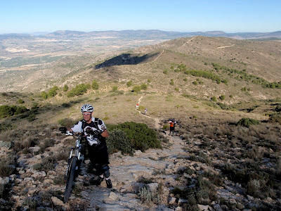 Des d’ací el cartell indica 15 minuts al cim. Així que sense pensar-ho maça, bici de nou a l’esquena (al final, si te la col·loques be, es com portar una motxilla de travessia :-P, 15 kilets a l’esquena). I poc a poc, amb els “bessons” ben carregats hem anat pujant fins arribar al cim: 1235 mts i son les 11:30. Després de l’esmorçar comença la baixada després d’haver desestimat una de les possibles baixades per ser maça bestia (un parell d’excursionistes que baixaven per ahi, anaven tot el rato en el cul per terra de la pendent). Així que fem l’altra baixada, primer per un tram prou tècnic amb final apoteòsic de rampa empinadissima de pedra amb escaló final (sols 3 baixen aquest pas: Jordi, jo perque anava seguint-lo i Polit).