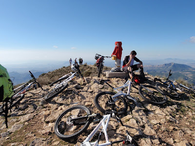Primer amb una bestial baixada que ningú se la ha fet sencera. Amb aquesta baixada Javi ha trencat la pata del canvi :O :O… No porta pateta de recanvi així que l’apanyo consisteix a posar-li la cadena fixa, a pesa de les meves advertències de que no funcionaria. I efectivament no funciona. La raó es que la suspensió al comprimir-se destensa la cadena que tendeix a baixar-la cap al pinyo petit i acaba eixint-se. Així que a partir d’ací li ha trucat espentar totes les pujades i deixar-se caure en les baixades. Després de la bestibaixada toca la bestipujada, bicis al coll i cap a dalt. Així un parell de voltes fins arribar al coll del Migjorn, just baix del pic.