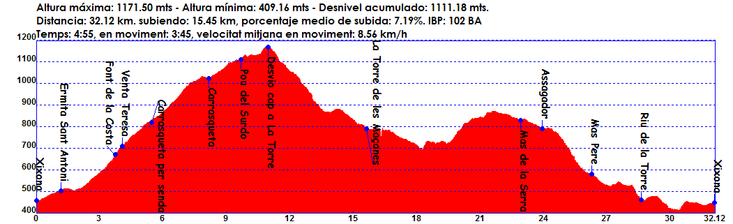 Em fet algunes variants respecte a l’original de l’altra volta. Em baixat per la senda que va cap als superdubbies, però en arribar al coll de baix, em continuat per una senda que va en direcció a la Torre. Jo no l’havia feta mai, i està xula, encara que plena de lloscos. Després un poc d’asfalt (el tram que havia marcat per evitar-lo no es factible) i reenganxem al track oficial. El tram aquest abans d’arribar a la Torre està prou tancat i perdut, com l’altra volta :-D.