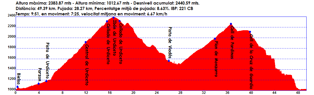 Feia molts molts anys que tenia ganes de repetir aquesta ruta, ja que la primera vegada que ho varem intentar fa uns 10 anys, la baixada de la Creu de Guardia cap a Bielsa va ser un infern, el camí no existia i varem estar hores i hores perduts intentant baixar. Ara ja sabiem que el camí estava prou net, i tocava repetir la ruta (Jordi i Alfonso ja l’havien fet fa un parell d’anys). La ruta es tot un repte, ja que amb més de 2400 mts de desnivell i una pujada de inicial de 10 km al 10%, fa que siga tot un desafiament.