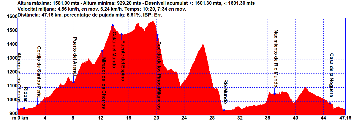 - Ruta Calar del Mundo: Riópar – Puerto del Arenal – Mirador de los Chorros – Calar del Mundo – Cuerda de los Pinos Milaneros – Rio Mundo – Cueva de los Chorros – Casa de la Noguera. Track. Track original de Jordi C. amb alguna petita variació de Andres de las Liebres de Yecla.